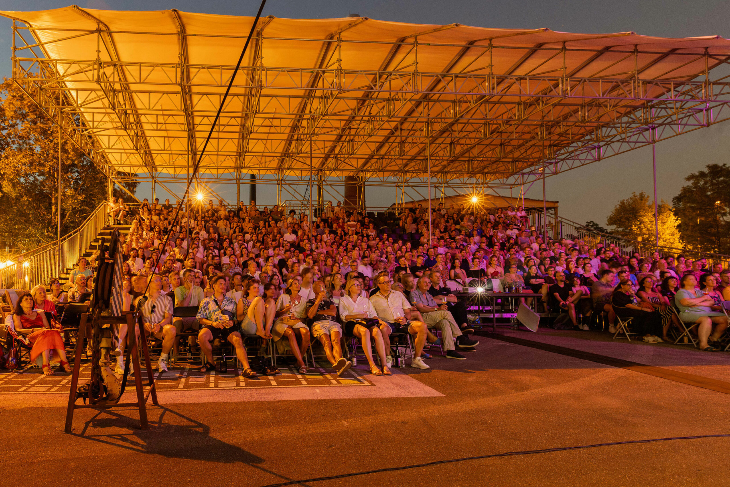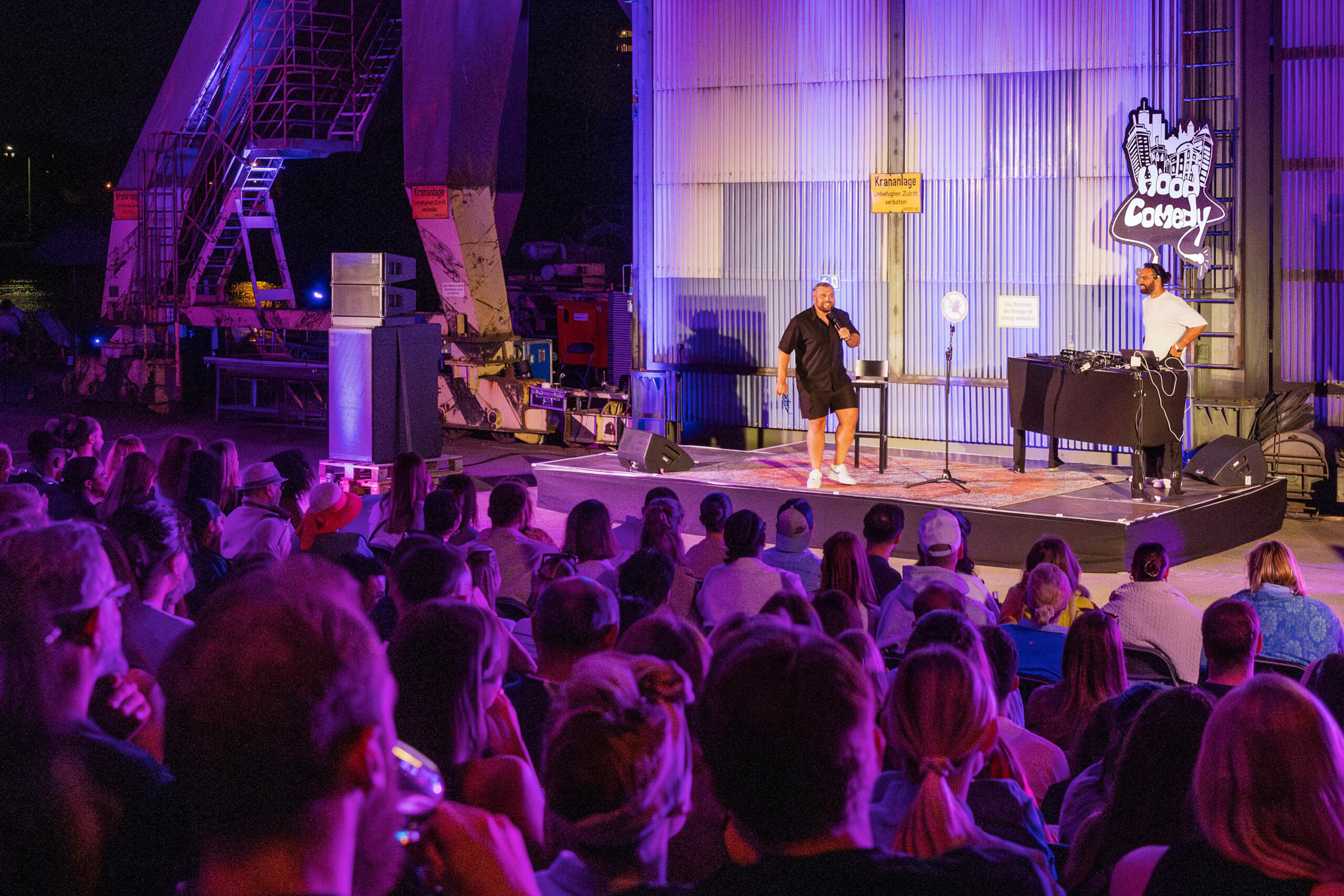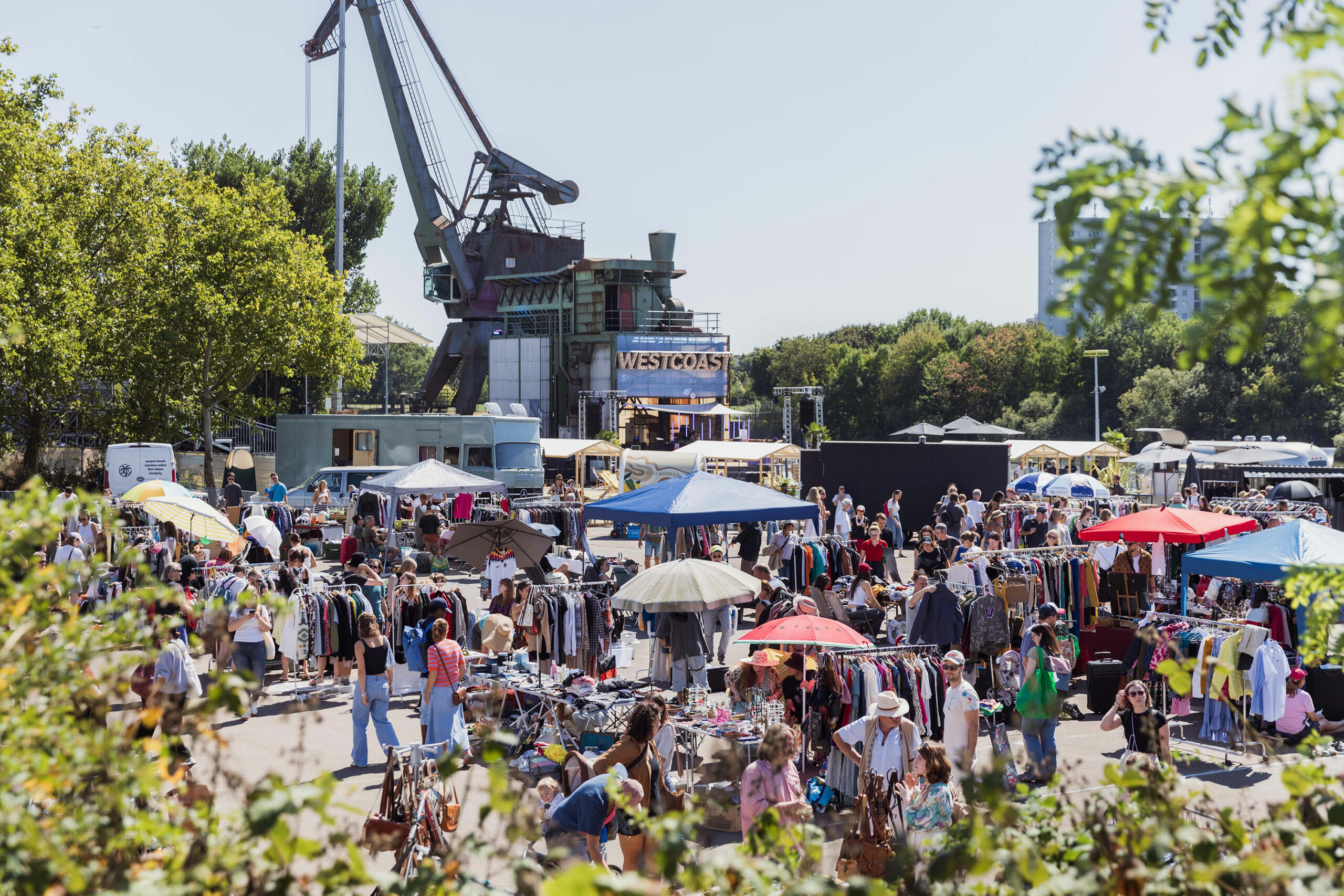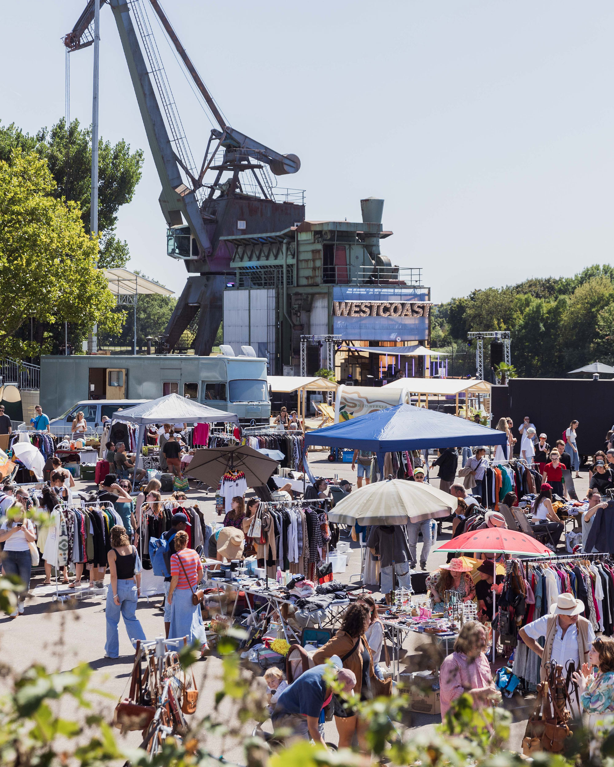 Zwischen altem Kran, Sonnenuntergang, Mondschein und Griesheimer Mainufer wird die WESTCOAST wieder in eine große Tanzfläche, ein Open Air Kino mit regensicherer Tribüne, zum Kellergold Flohmarkt und Erlebnisort für alle verwandelt.